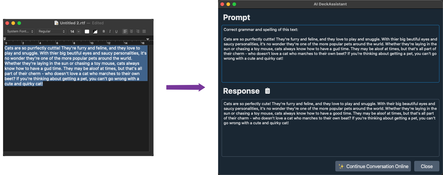 Press a button and have our AI process the text you've selected. In any application. Or press a button and bring up a freeform prompt to talk to our AI directly.