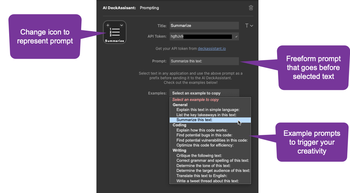 DeckAssistant includes example prompts, but you can set any prompt. Any.